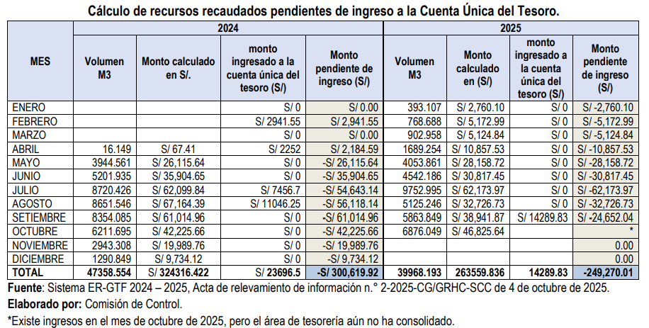 El asesor calificó como «grave» lo señalado en el documento respecto a los montos pendientes de ingreso a la tesorería de la Dirección Regional de Agricultura. El informe detalla que S/ 300,619.92 corresponden al 2024, S/ 249,270.01 hasta septiembre de 2025, además de S/ 95,532 por guías en 2024 y S/ 113,594.50 hasta octubre de 2025, sumando un total de S/ 759,016.43 que no ingresaron a la cuenta única del Tesoro.