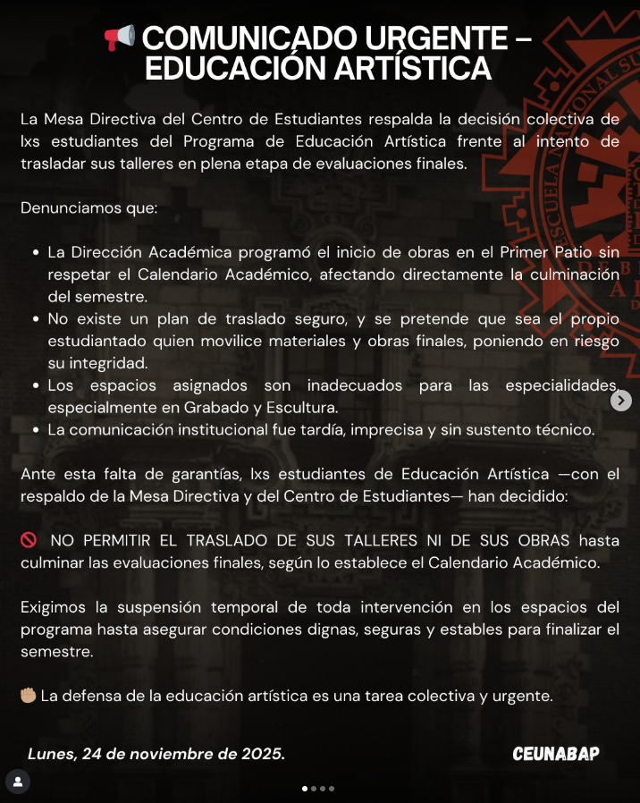 Según los estudiantes, la Dirección Administrativa autorizó los trabajos sin previo aviso ni coordinación, sorprendiéndolos el 21 de noviembre, el mismo día en que se emitió el comunicado oficial, a pesar de que las obras habrían iniciado el 18. Alumnos de Educación Artística, en particular, se ven imposibilitados de trasladar sus obras de gran formato, instalaciones y materiales pesados, esenciales para el cierre académico 2025, sin comprometer su trabajo.