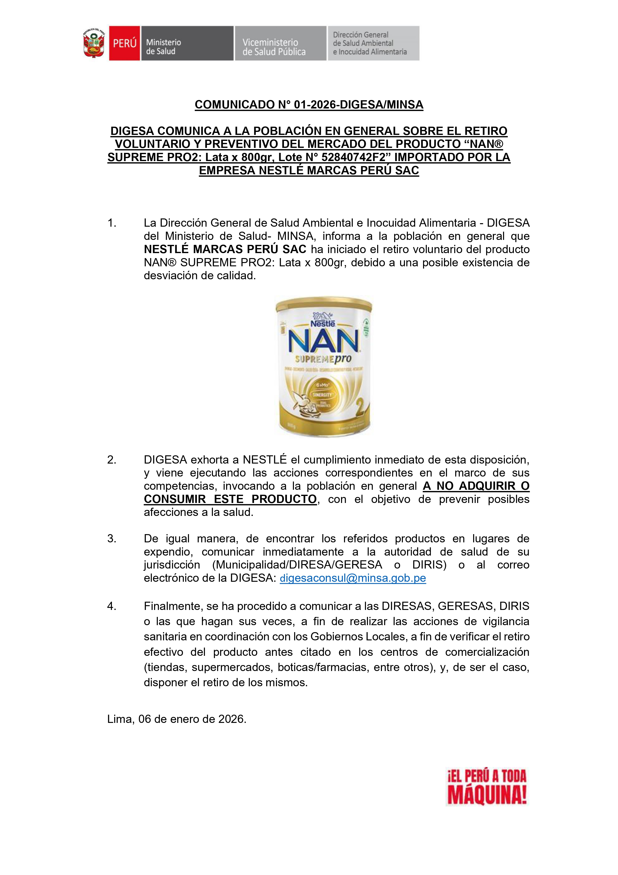 La Dirección General de Salud Ambiental e Inocuidad Alimentaria (Digesa), adscrita al Ministerio de Salud, ha confirmado el retiro preventivo y voluntario del mercado peruano de un lote especÃfico de la leche infantil en polvo ‘NAN Supreme Pro 2’ de Nestlé Marcas Perú S.A.C. La decisión, comunicada oficialmente el 6 de enero de 2026, responde a una ‘posible desviación de calidad’ detectada por la propia empresa, pero deja abierta la cuestión sobre la eficacia y proactividad de nuestros mecanismos de vigilancia sanitaria ante productos esenciales para la población más vulnerable.
