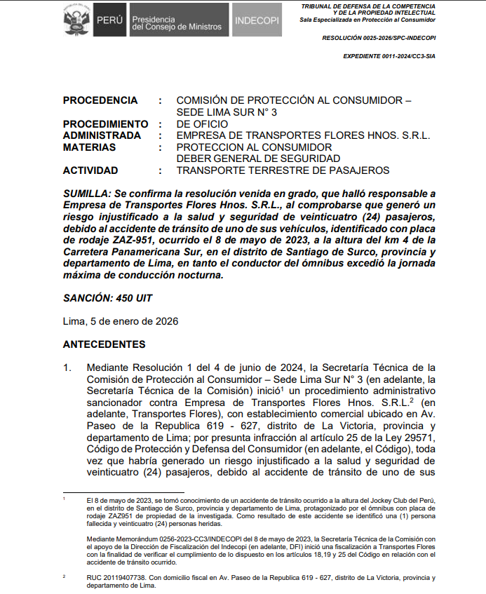 El caso se originó a partir de una investigación de oficio iniciada por la Secretaría Técnica de la Comisión de Protección al Consumidor N.º 3, que identificó una posible infracción al artículo 25 del Código de Protección y Defensa del Consumidor, el cual exige a los proveedores asegurar la seguridad de sus servicios. A lo largo del proceso, se recopiló información clave de la Policía Nacional del Perú, la Sutran y el Ministerio Público. La empresa Transportes Flores, el 21 de agosto de 2024, presentó documentos sobre gastos médicos de 13 pasajeros y el registro de turnos del conductor, intentando revertir la decisión. Sin embargo, la resolución N.° 0025-2026/SPC-INDECOPI ratificó la sanción en segunda instancia.