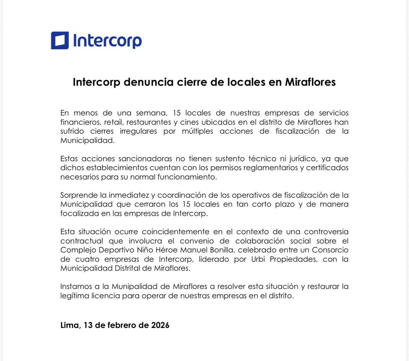 El 13 de febrero, Intercorp emitió un comunicado tajante, calificando las clausuras de sus 15 locales (según su conteo) como carentes de sustento técnico y jurídico. El holding empresarial afirmó que todos sus establecimientos cuentan con los permisos y certificados reglamentarios. De forma contundente, el grupo vinculó las acciones municipales a una “controversia contractual” por el convenio de colaboración social del Complejo Deportivo Manuel Bonilla, celebrado con un consorcio liderado por Urbi Propiedades. Intercorp cuestiona la rapidez y la focalización de las fiscalizaciones, instando a la autoridad edil a restaurar sus licencias. La municipalidad niega cualquier retaliación, pero la vehemencia de Intercorp al vincular ambos casos exige una transparencia absoluta.